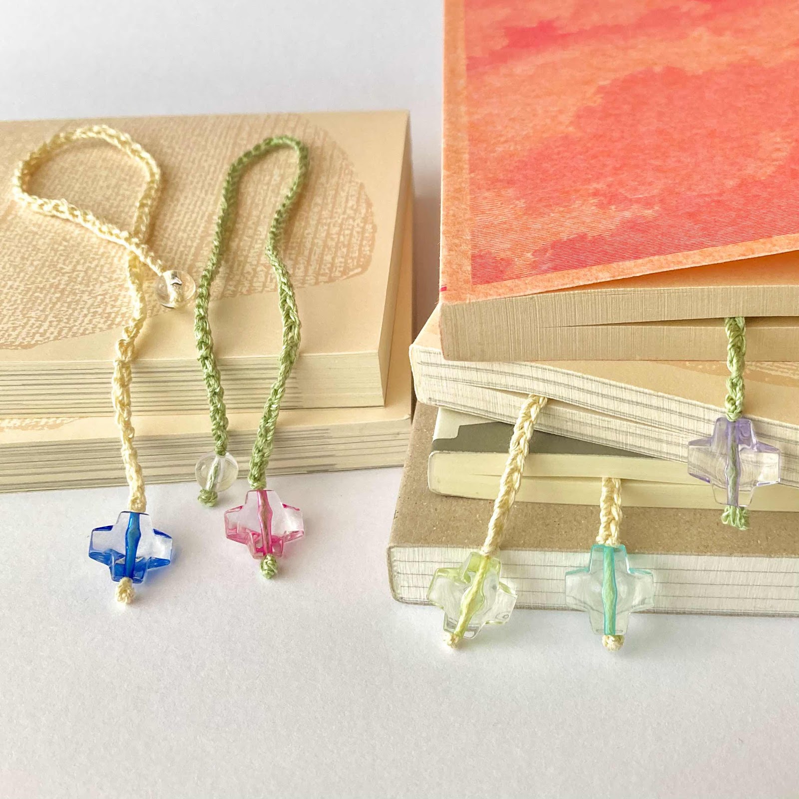 光沢のあるコットンの毛糸を手編みして作ったコードに、クロス(十字)の形のビーズを結びつけて、心身の安全を祈る気持ちを表現しました。